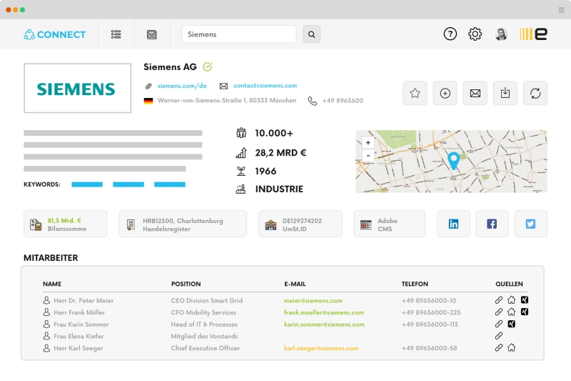47 Millionen Ansprechpartner inklusive  öffentlich verfügbare Kontaktdaten, Positionsbezeichnung, Abteilung und Social Account (XING / LinkedIn).