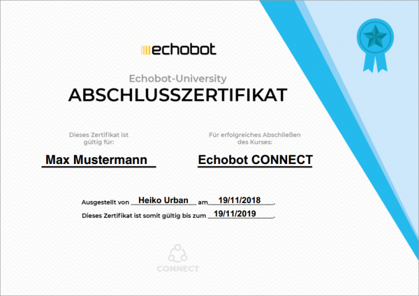 Vielleicht sind Sie aber auch schon ein richtiger Experte? Dann wird es an der Zeit, dass das honoriert wird! Mit Ihrem persönlichen Zertifikat bekommen Sie Ihr Wissen jetzt schwarz auf weiß und können Ihrem Vorgesetzten belegen, dass Sie für den geschulten Umgang mit den Echobot Tools qualifiziert sind. Umgekehrt können Sie als Geschäftsführer so sicherstellen, dass Ihre Mitarbeiter Echobot so richtig auszuschlachten verstehen und für Sie den größten Nutzen draus ziehen.