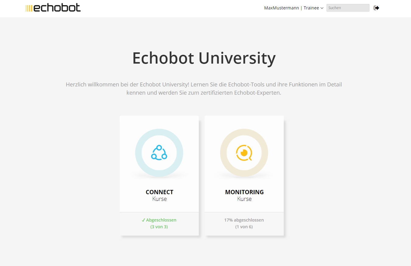 Die Echobot UNIVERSITY steht Ihnen als unser Kunde kostenlos und ab sofort zur Verfügung. Testen Sie gleich Ihr Wissen und belohnen Sie sich mit Ihrem Zertifikat! Den Zugang finden Sie direkt im Echobot Login-Bereich.