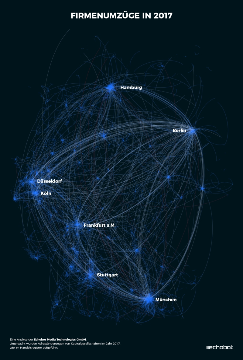 Die deutsche Firmenlandschaft steht nicht still. Im Gegenteil: Die Firmen waren im letzten Jahr sogar so mobil, dass sich aus den Umzugsbewegungen deutlich eine Landkarte mit einigen großen Städten als Knotenpunkten abzeichnet.