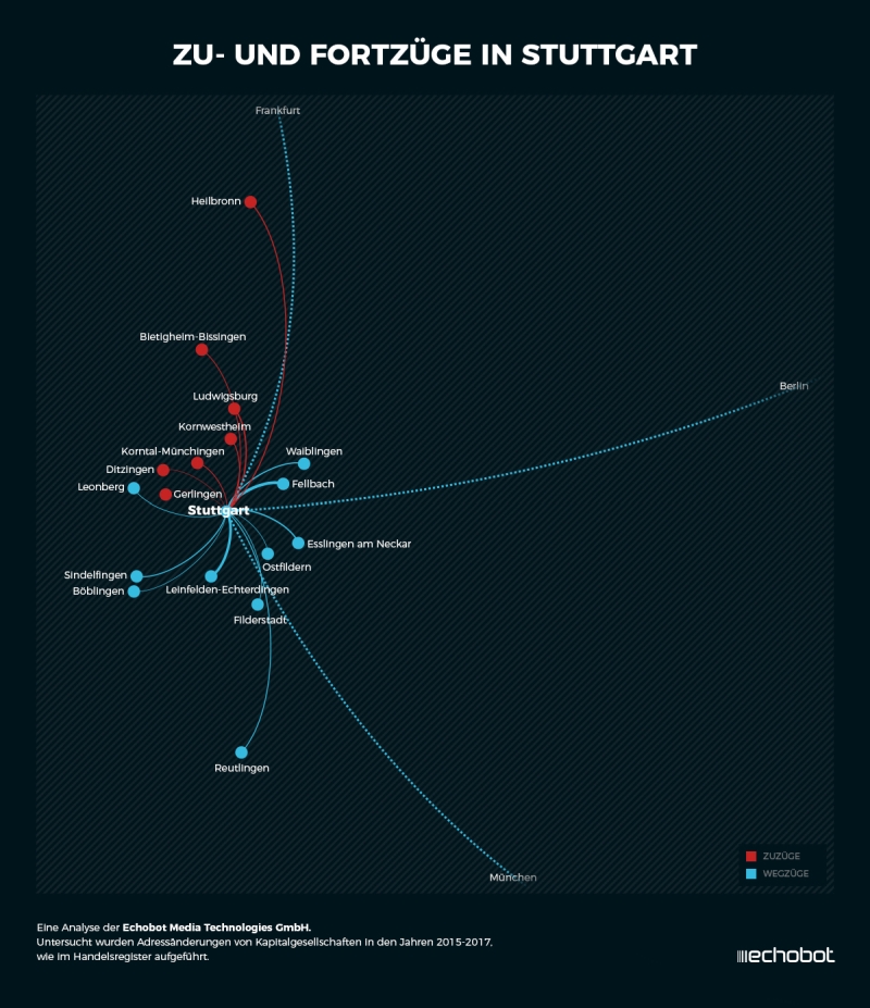 Die nächste Grafik zeigt am Beispiel der Stadt Stuttgart die Zuzüge in rot und die Fortzüge in blau. Die meisten Fortzüge führen ins direkte Umland von Stuttgart, die Firmen bleiben also in der „Umlaufbahn“, im Magnetfeld der Stadt.