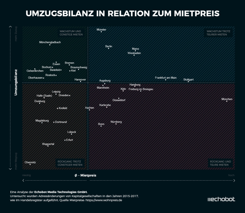 Dennoch gibt es auch einige Städte, deren Mietpreise sehr günstig sind, die aber trotzdem mehr Firmen verlieren als dazugewinnen, wie z.B. Chemnitz, Wuppertal und Magdeburg.