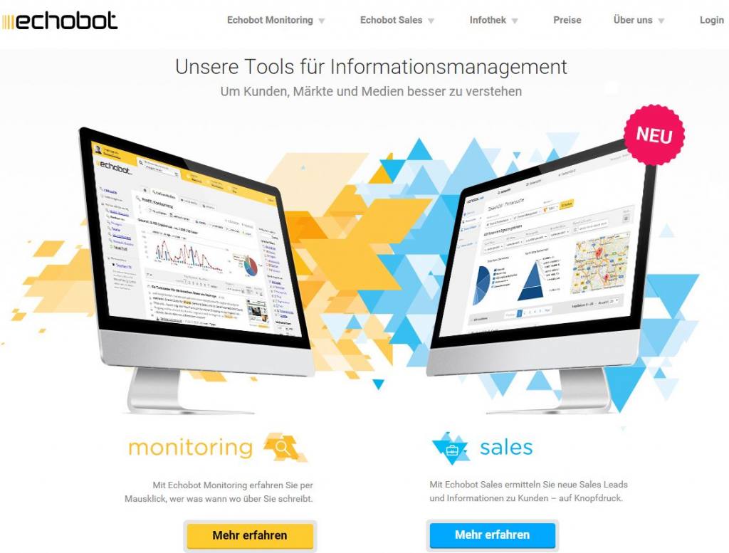 Außerdem können Sie die neuen Logos entdecken, die wir für jeden Produktbereich kreiert haben. Unser gewohntes Monitoring-Tool heißt nun Echobot Monitoring und ist weiterhin in Gelb gehalten. Unser neues Smart-Data-Tool Echobot Sales erkennen Sie an der blauen Farbe sowie dem blauen Logo.