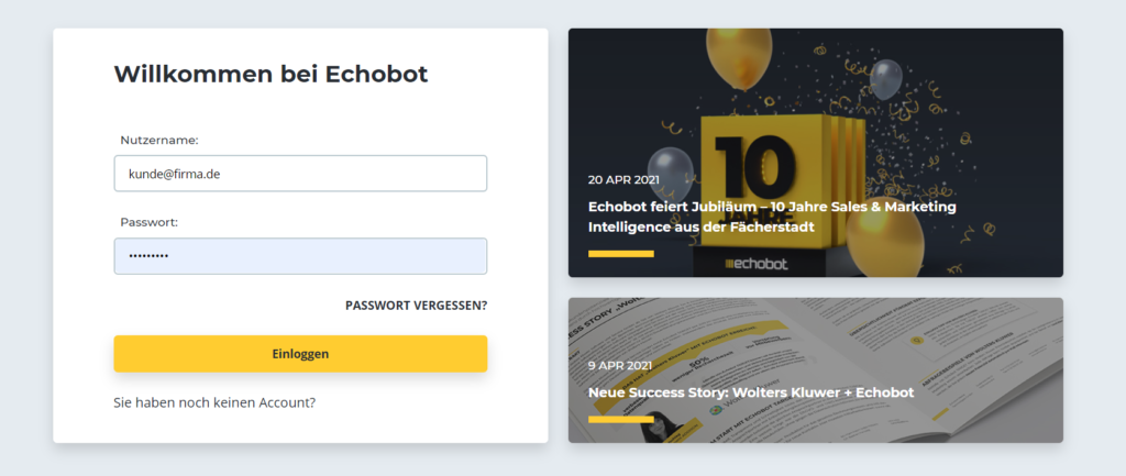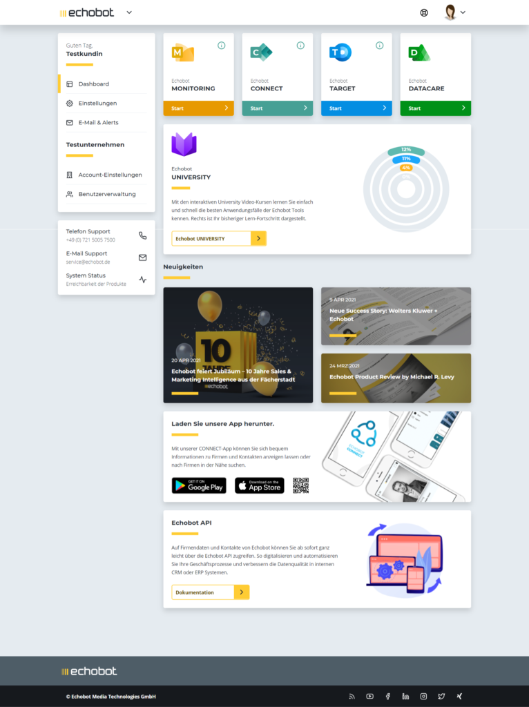Endlich ist es soweit: Wir empfangen Sie jetzt schöner, moderner und vor allem übersichtlicher – der Loginbereich zu Ihren Echobot Tools glänzt ab sofort in neuem Design und enthält nun noch mehr Funktionen. Dieser Bereich ist Ihr neuer Wegweiser, der Sie intuitiv zwischen den Echobot Tools, Ihren Einstellungen und der University navigiert.
