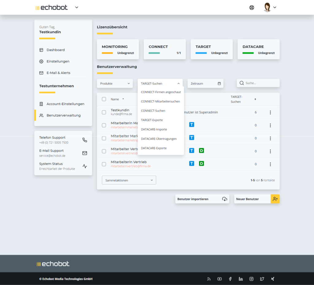 Als Admin erhalten Sie jetzt einen deutlich besseren Überblick über Ihren Unternehmensaccount. Welche User sind für welche Tools freigeschaltet? Ein großer Kundenwunsch war das User Tracking in CONNECT: Finden Sie jetzt auch heraus, wie aktiv die User die Echobot Tools nutzen.