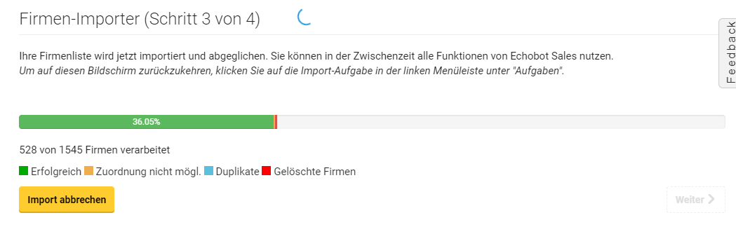 Erhalten Sie schon während des Vorgangs ein ausführliches Feedback über den Erfolg Ihres Firmenimports. Erkennen Sie auf einen Blick, welcher Anteil der Firmen erfolgreich erkannt wurde und welcher nicht. Gab es Duplikate oder schon erloschene Firmen in Ihren Daten? All das erkennen Sie jetzt in der Upload-Übersicht.