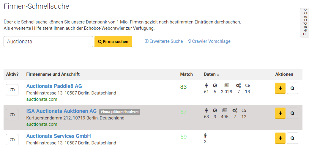 Durch die aktuellen Daten aus dem Handelsregister, erkennt Echobot, wenn eine Firma bereits gelöscht wurde durch eine Insolvenz oder Umfirmierung. Diese Information geben wir Ihnen natürlich in Ihren Suchergebnissen und Firmenlisten anhand einer Markierung weiter.