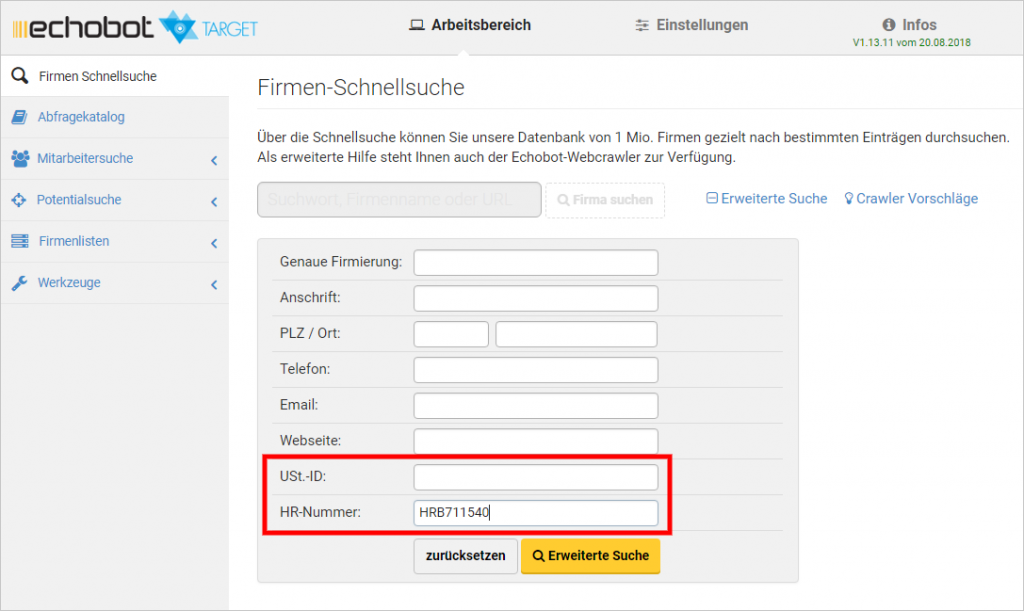 An verschiedenen Stellen erleichtern wir Ihnen die Firmensuche über die Eingabe von ID´s. Das hat den Vorteil, dass Sie eine Firma eindeutig identifizieren oder besser mit Ihren Daten abgleichen können. Falls Sie also regelmäßig entweder mit der Umsatzsteuer-ID, der Handelsregisternummer oder der Echobot ID arbeiten, dann suchen Sie ab sofort nach:
