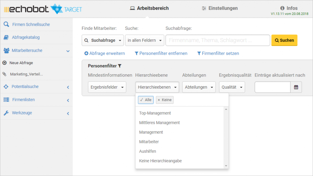 Sie haben in der Echobot Datenbank noch nie nach Firmen oder Ansprechpartnern gesucht? Dann ist jetzt die Zeit das auszuprobieren! Profitieren Sie auch von regelmäßigen Updates und testen Sie Echobot unverbindlich: