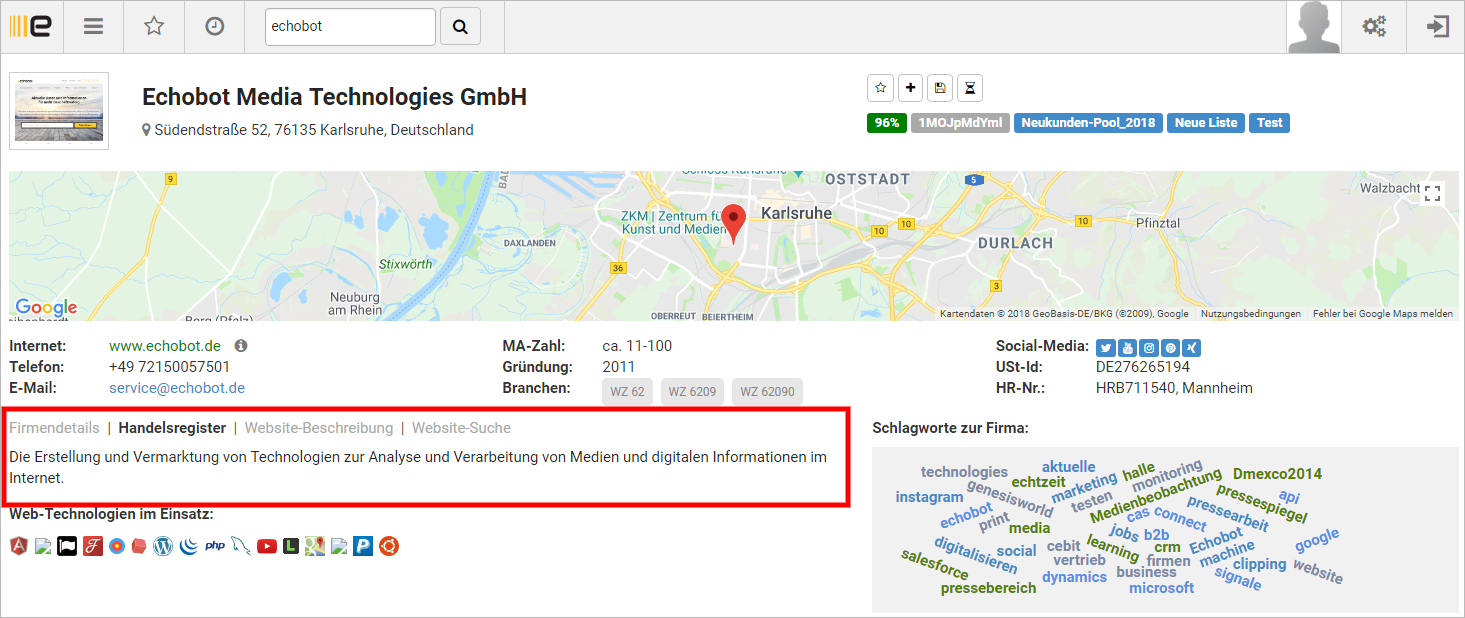 Wenn Sie mit Echobot TARGET nach bestimmten Beschreibungen oder Keywords suchen, dann nutzt unsere Suchmaschine hierfür selbstverständlich jetzt auch die Informationen aus Handelsregister und Firmenwebseite, um Ihnen passende Ergebnisse zu liefern.