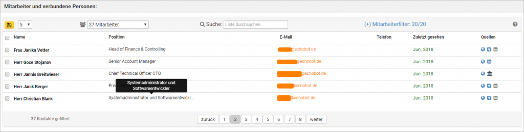 - Wer zwar schon einen breiten Bildschirm besitzt und dennoch nicht die gesamte Positionsbeschreibung eines Mitarbeiters in einer Spalte angezeigt bekommt, der kann sich jetzt einfach per Mouseover den vollständigen Titel anzeigen lassen.