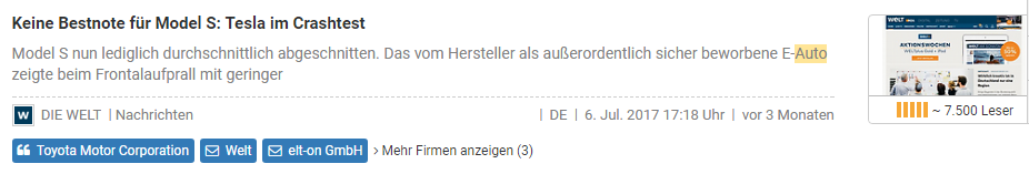 Die Texterkennung haben wir jetzt auch als Funktion mit einfließen lassen. Auf Wunsch zeigt Echobot Ihnen die erkannten Firmen aus jedem Artikel an. Sehen Sie auf einen Blick, mit welchen Unternehmen Sie in einem Atemzug genannt werden.