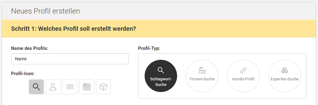 • Wer viele Suchprofile in seinem Account vereint, weiß, wie wichtig Ordnung ist. Bei der Erstellung der Suchprofile wählen Sie deshalb im ersten Schritt jetzt nur noch aus vier Profil-Typen aus. Firmen-Suche, Kombi-Profile und die Experten-Suche bleiben bestehen. Die restlichen Auswahlmöglichkeiten haben wir in einem Schlagwort-Suchprofil zusammengefasst. Darunter markieren Sie weiterhin mithilfe unterschiedlicher Icons die Art Ihres Suchprofils – Personen, Themen, Produkte oder Veranstaltungen. So behalten Sie den Überblick.