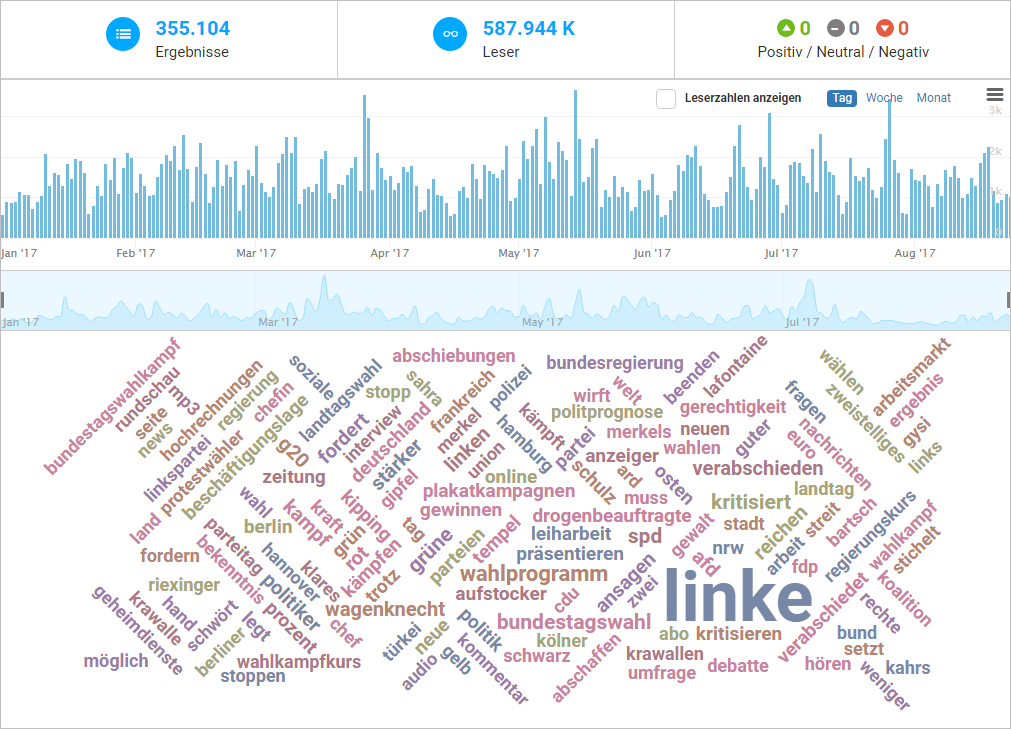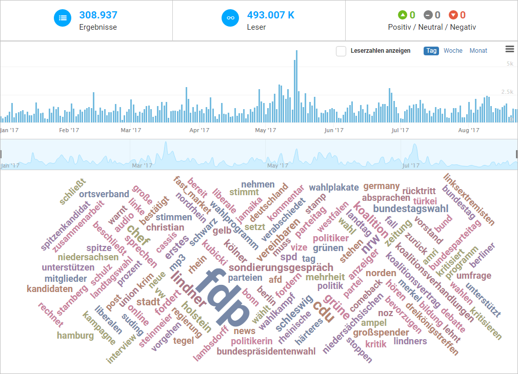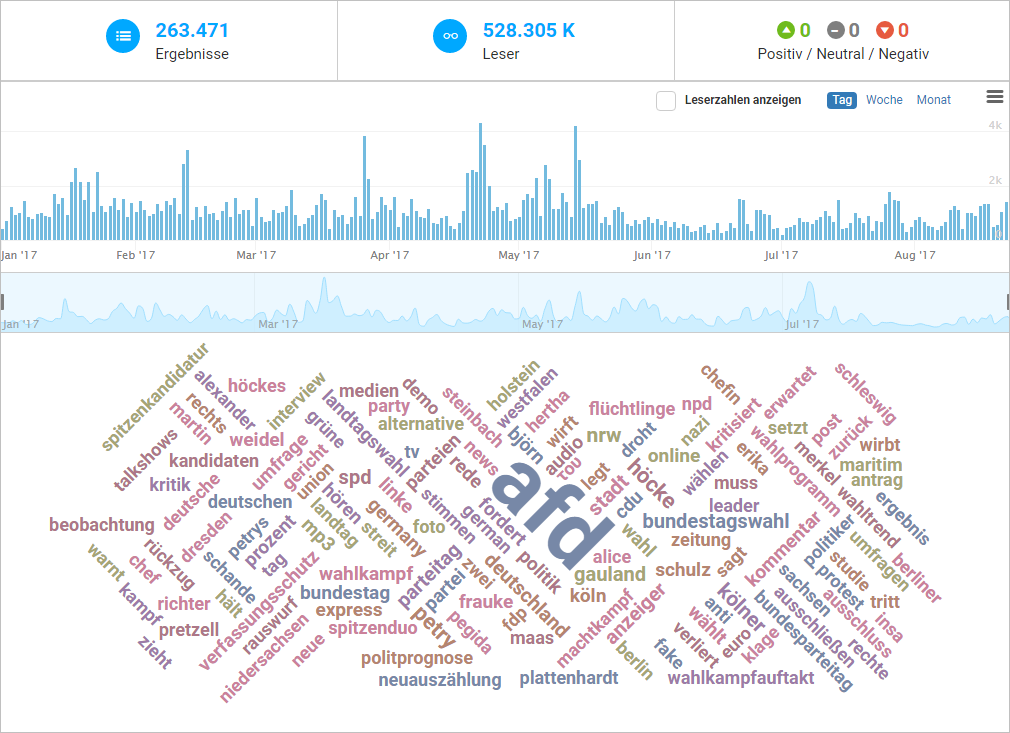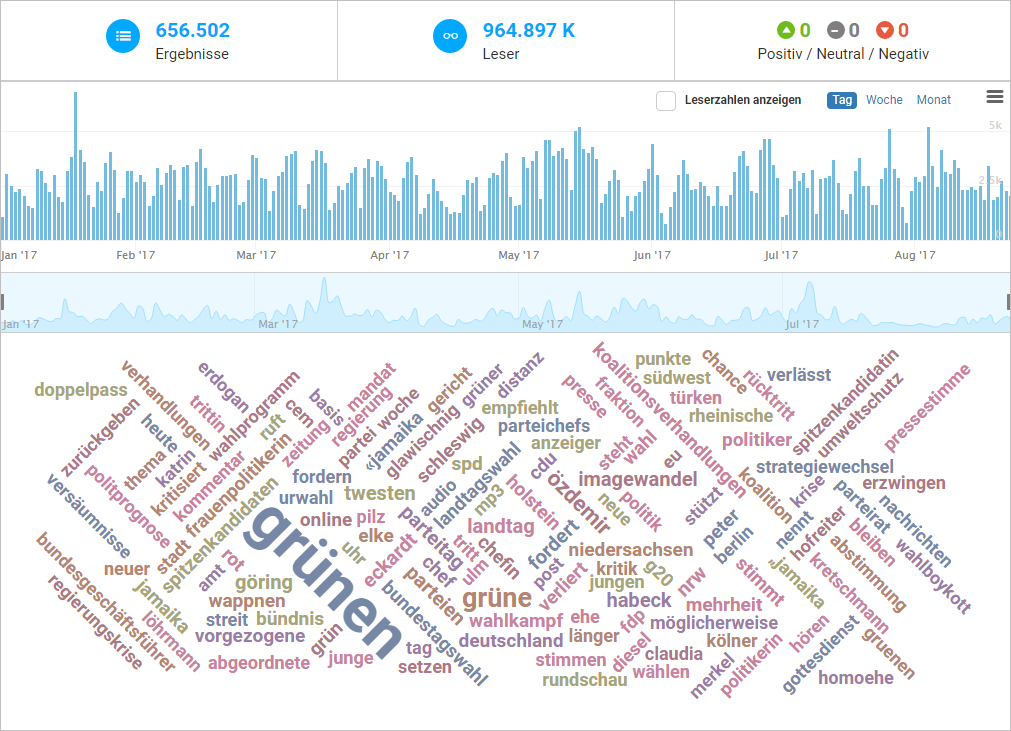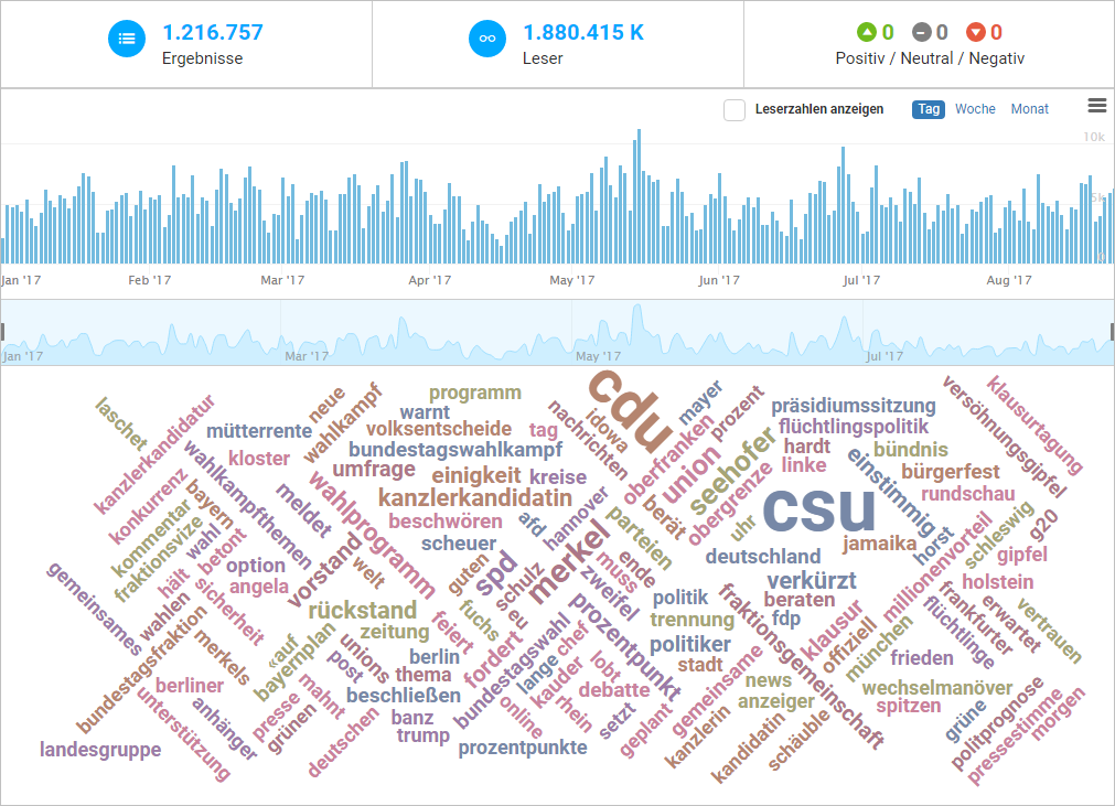 Sie sehen in der jeweiligen Grafik die Anzahl der Ergebnisse und die Leserzahlen. Im Zeitverlauf sind, wie oben, die tägliche Summe der Erwähnungen der jeweiligen Partei dargestellt. Für die Themenanalyse fasst die TagCloud die häufigsten Schlagworte auf einen Blick zusammen.