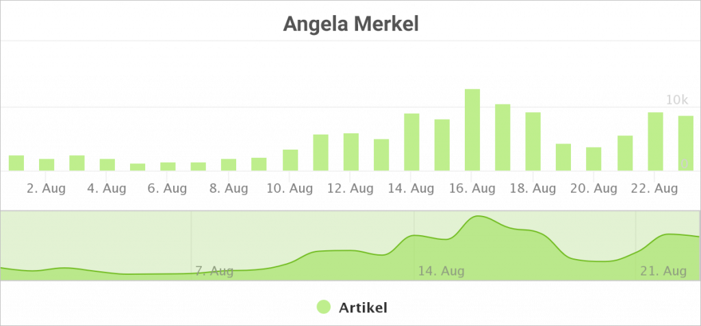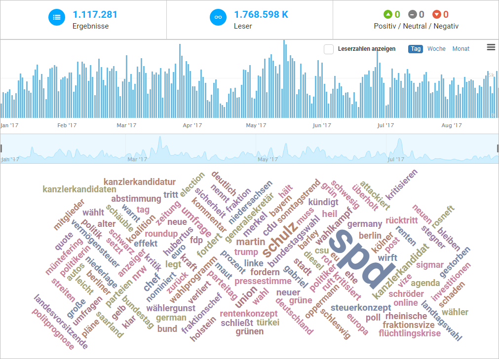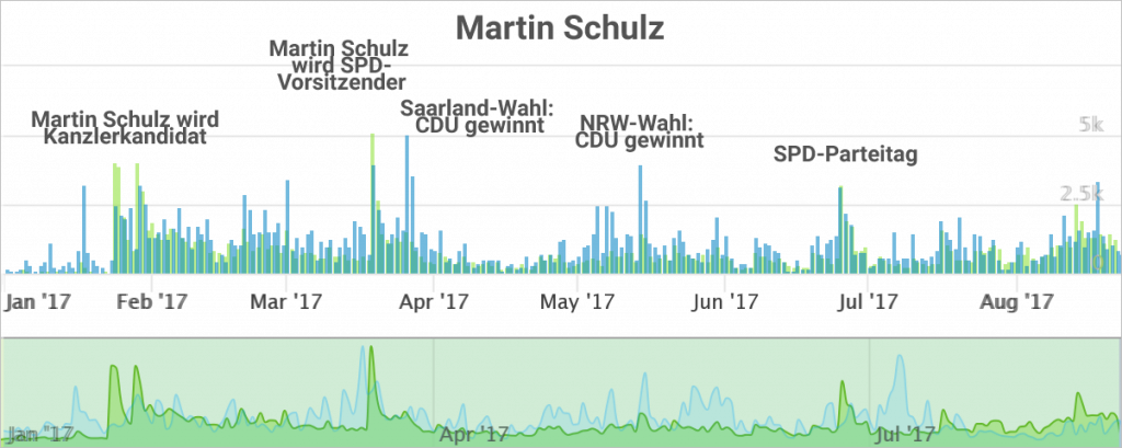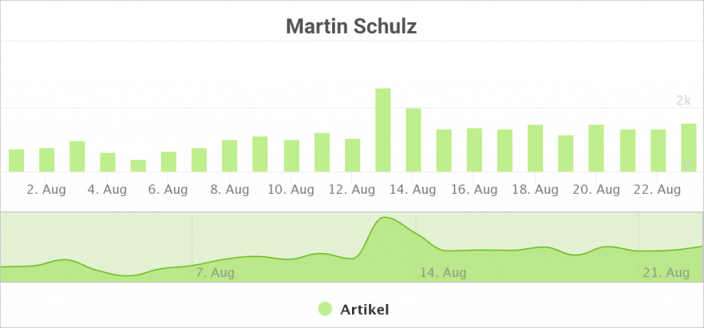 Auch bei der SPD um Martin Schulz bahnt sich langsam ein leichter Aufwärtstrend in den Meldungen an, was auf den Wahlkampf schließen lässt. Am 13. August haben gleich zwei TV-Auftritte des Kandidaten für einen Aufschwung gesorgt: