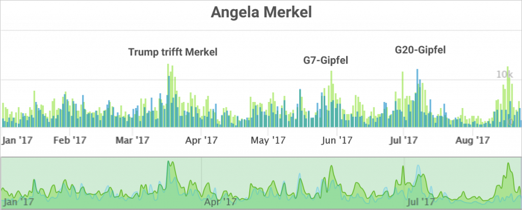 Bei Merkel und Schulz scheint der Wahlkampf seit August deutlicher anzulaufen. Deshalb haben wir den Zeitraum im August noch einmal detaillierter zusammengestellt. Da uns hier nochmal mehr die Meinungen der Wähler interessieren, haben wir uns auf die sozialen Netzwerke beschränkt: