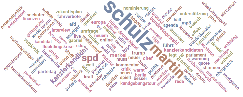 Im Vergleich hierzu die meist genannten Themen zum Kanzlerkandidaten Martin Schulz. Auch hier finden sich einige Wahlkampfthemen wieder. Ganz am Rand finden sich trotz der eher ernüchternden Prognosen bisher die Worte Hoffnungsträger und sogar Wahlsieg.