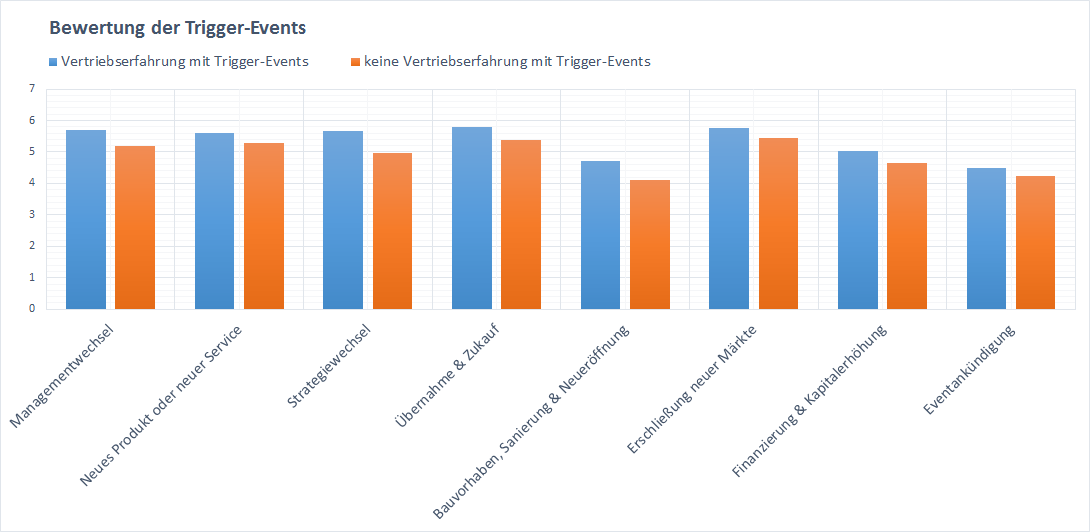 Unsere Studie lieferte zusätzlich Hinweise auf die Bedeutung von Trigger-Events für die Vertriebspraxis. Die Befragten, die schon Vertriebserfahrung damit gesammelt haben, messen jedem unserer ausgewählten Ereignisse eine höhere Bedeutung zu, als diejenigen, die noch unerfahren sind und abschätzen müssen. Das lässt darauf schließen, dass Sie mehr profitieren, als Sie vermuten.