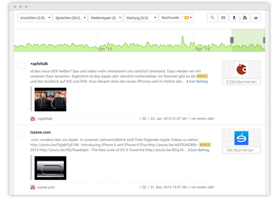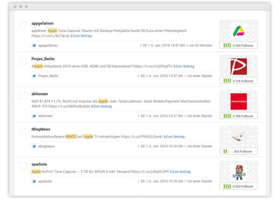 Mit jedem Treffer erhalten Sie den direkten Link zur Konversation auf dem Social-Media-Netzwerk und können so die dort stattfindende Konversation verfolgen oder mit wenigen Klicks direkt selbst aktiv werden. Über Kennzeichen können Sie bestimmte Beiträge auch für die spätere Bearbeitung an Ihre Kollegen delegieren.