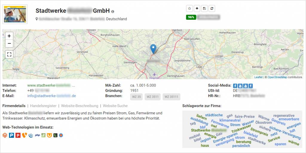 Die News und aktuelle Signale verraten schnell, was die Stadtwerke gerade beschäftigt. Auch die Finanzkennzahlen und der Beherrschungsgraph mit den Handelsregisterdaten ist meist doch einen Blick wert. Das macht den Kontakt gleich viel angenehmer und effektiver.
