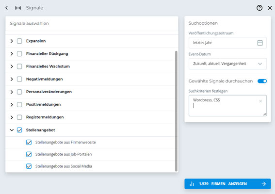 Finde dank über 30 Sales Triggern genau die Unternehmen, die für Dich relevant sind. Filtere nach Stellenangeboten, Insolvenzen, Managementwechsel und vielem mehr. Unterteile Deine Kunden in Gewinner und Verlierer und erkenne so den optimalen Zeitpunkt für die Akquise. Die Sales Trigger liefern Dir außerdem den passenden Gesprächseinstieg!