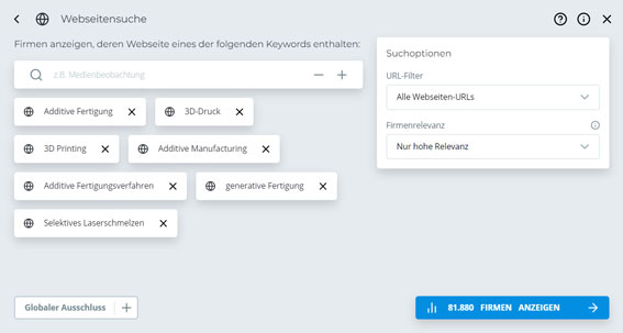 Du suchst nach Unternehmen, die SAP oder HubSpot benutzen, familiengeführt sind oder spezifische Fertigungsmethoden einsetzen? Mit unserer Websitesuche kannst Du Webseiten von Firmen nach Deinen individuellen Keywords und Schlagworten durchsuchen – und siehst sofort, welche Unternehmen für Deine Akquise infrage kommen.